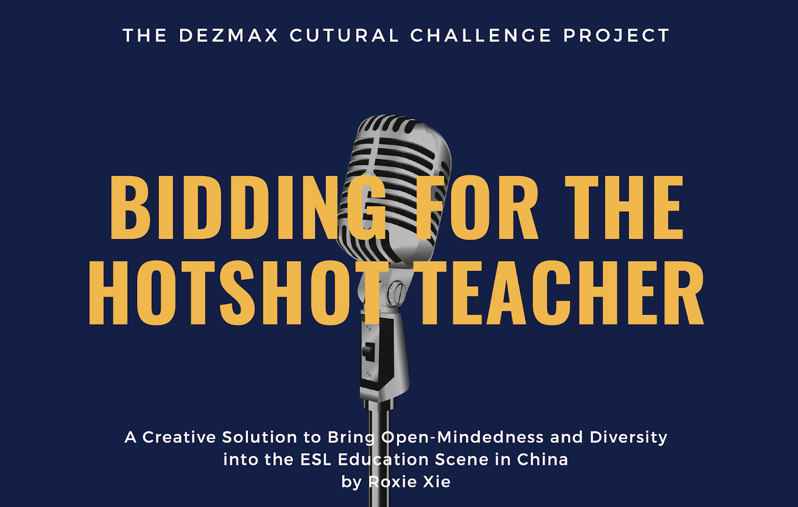 Roxie's proposal, "Bidding for the Hot Shot Teacher," was based on her native understanding of Chinese society where proficiency in English is highly valued, but only when that skill is taught by American and British speakers who are white. According to her research, this has resulted in an explosion of tutoring services in which 96% of ESL teachers are caucasian.